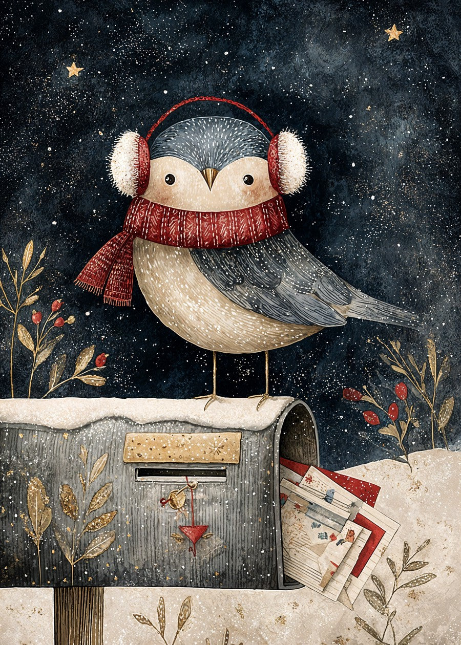 A cozy winter bird in earmuffs and scarf perches on a snowy mailbox full of holiday letters under a starry sky in this festive scene.