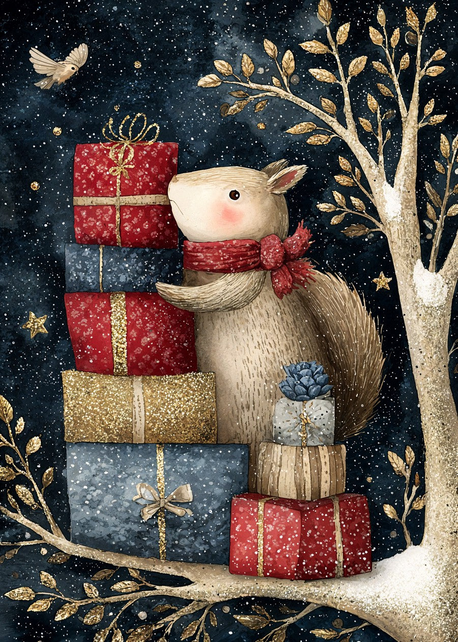 A festive squirrel stacks glittery gifts under a starry sky in this charming woodland Christmas illustration full of warmth and whimsy.