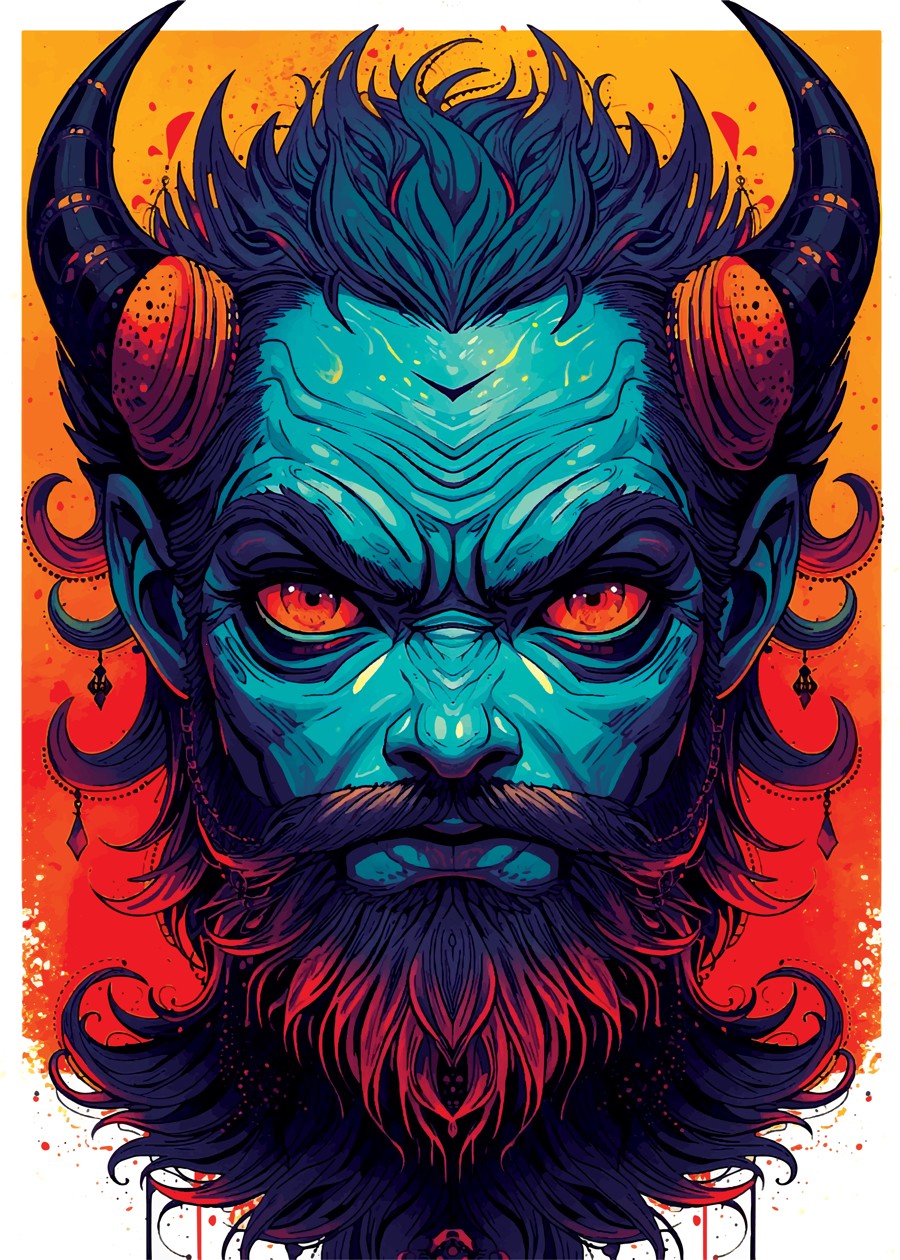 An illustration of a psychedelic monster amidst flashy, blazing colors