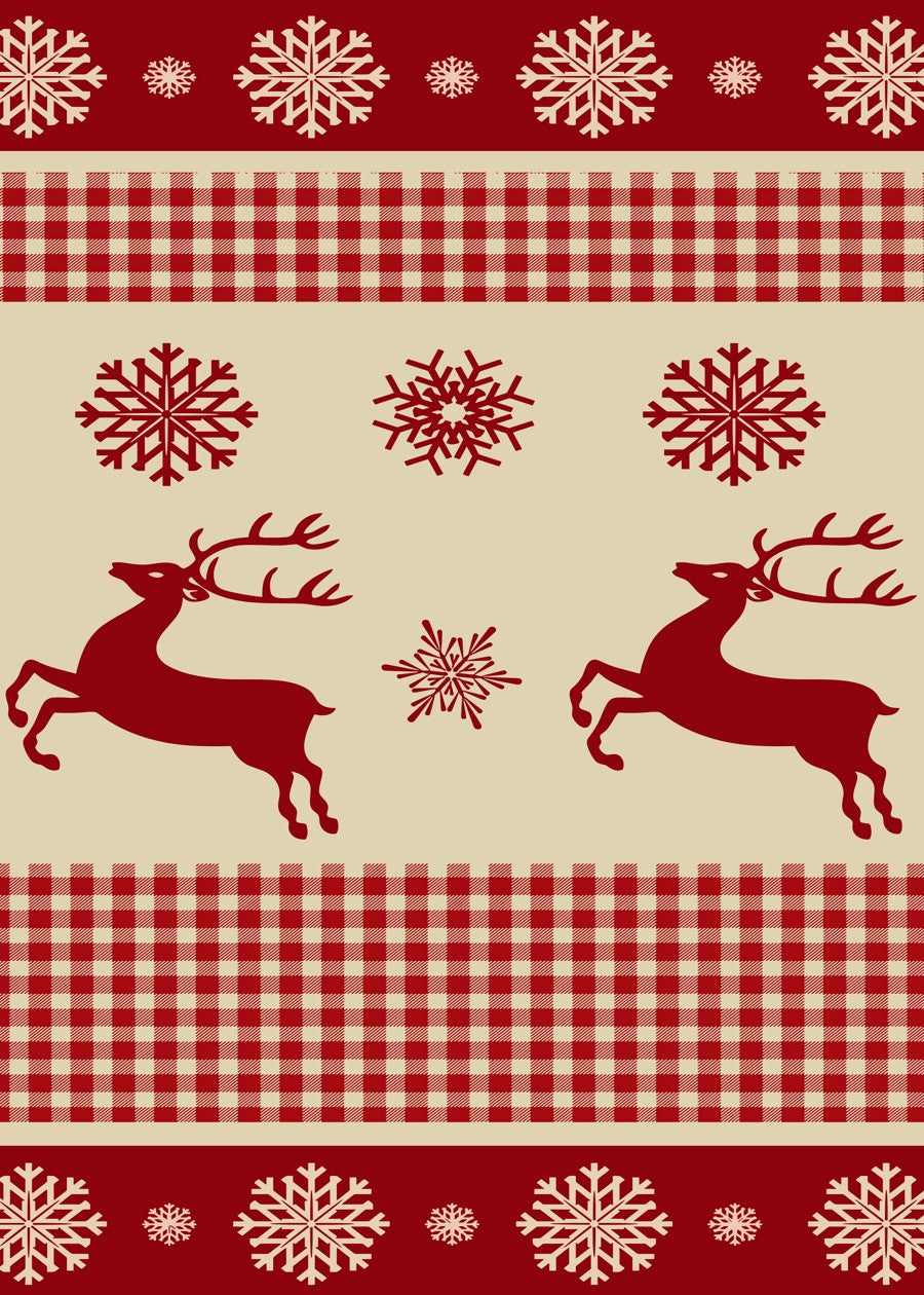 A traditional holiday design with prancing reindeer, snowflakes, and checked patterns in red and beige.