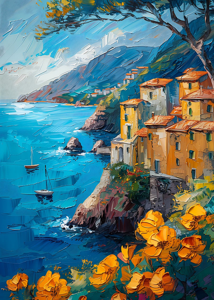 Vibrant coastal village overlooking a serene azure sea under a bright sky.