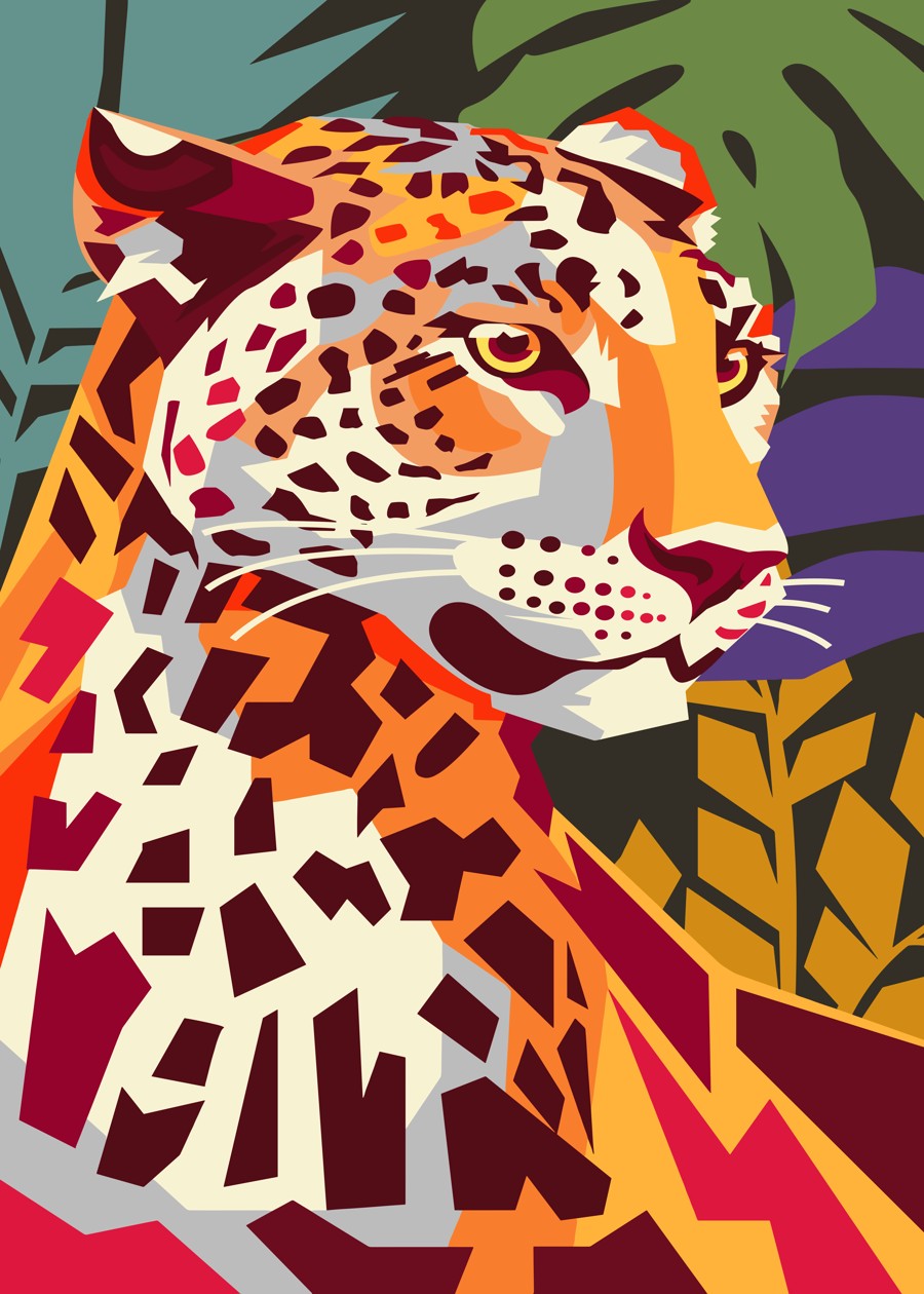 A vibrant, stylized illustration of a leopard crafted from geometric shapes and bold colors.