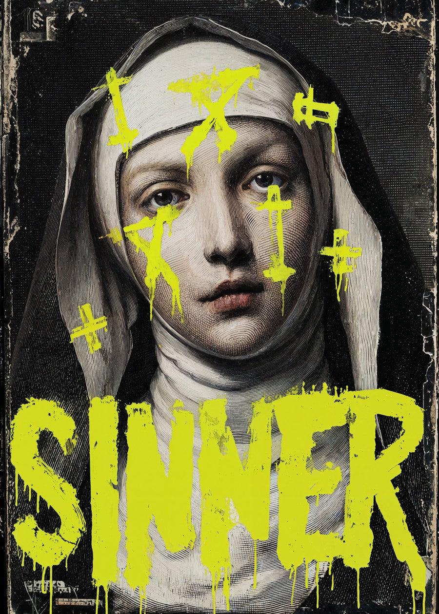 A stark nun portrait defaced with neon yellow graffiti, challenging the divine with dripping crosses and raw rebellion. A modern heresy.