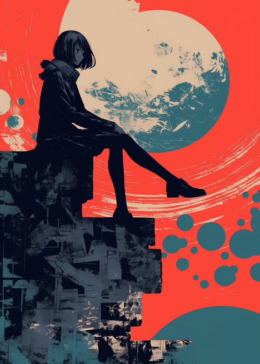 The image features a stylized illustration of a woman sitting on an abstract, blocky structure.