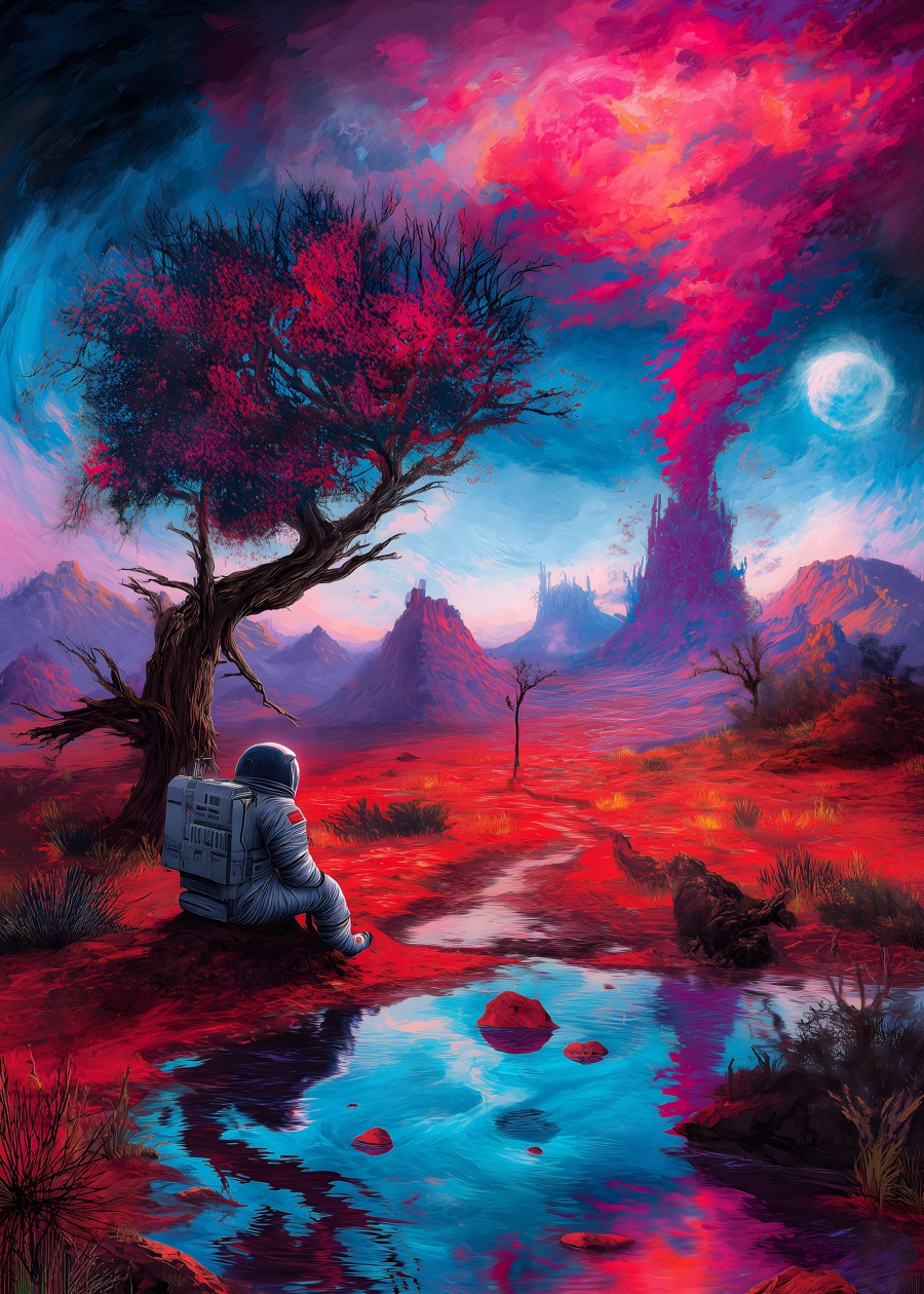 An astronaut ponders in a vibrant alien landscape under a mystical sky.