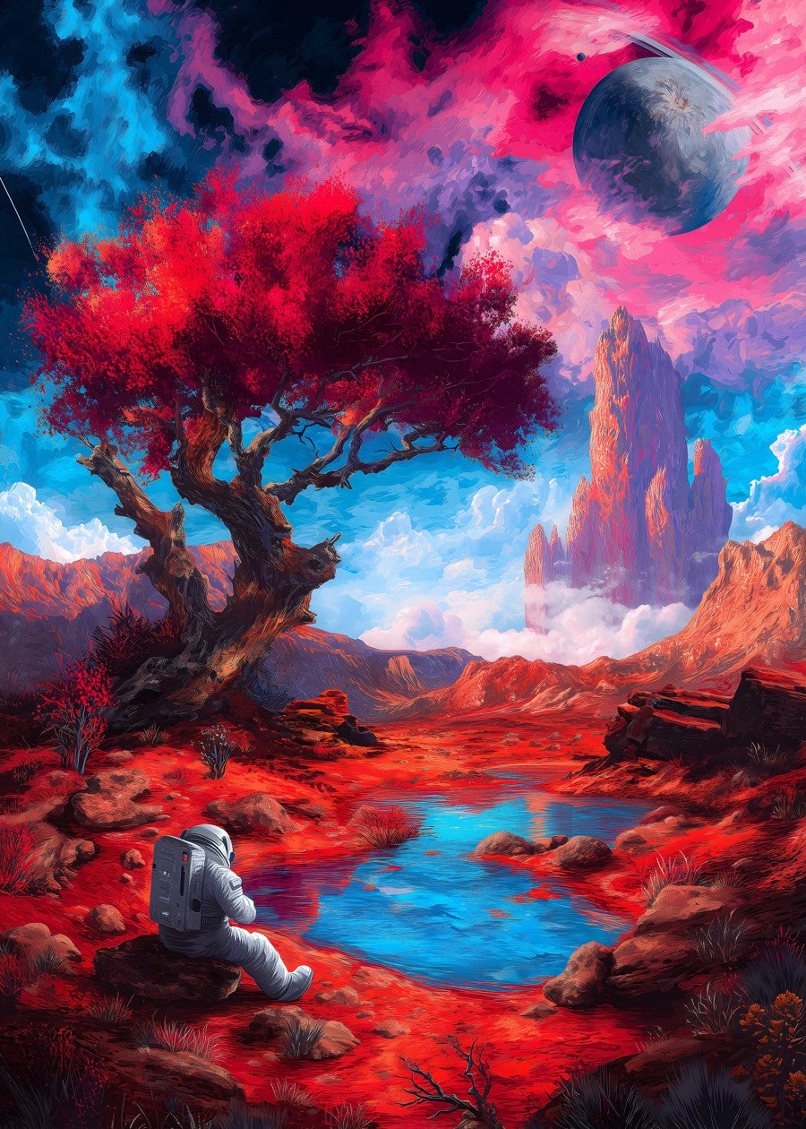 An astronaut rests by a vibrant oasis under a surreal alien sky.