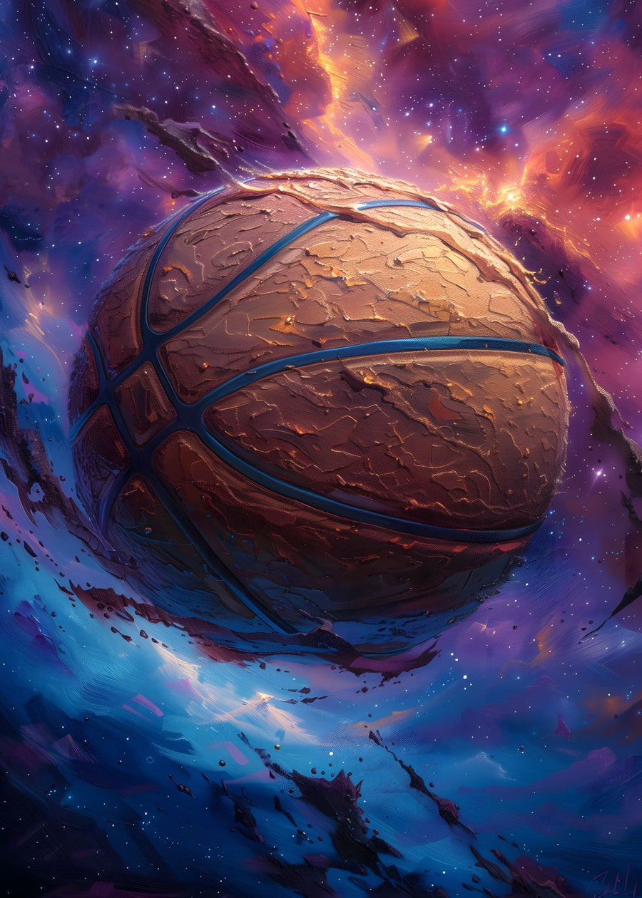A giant basketball floats through a vibrant galaxy, merging sport and space.