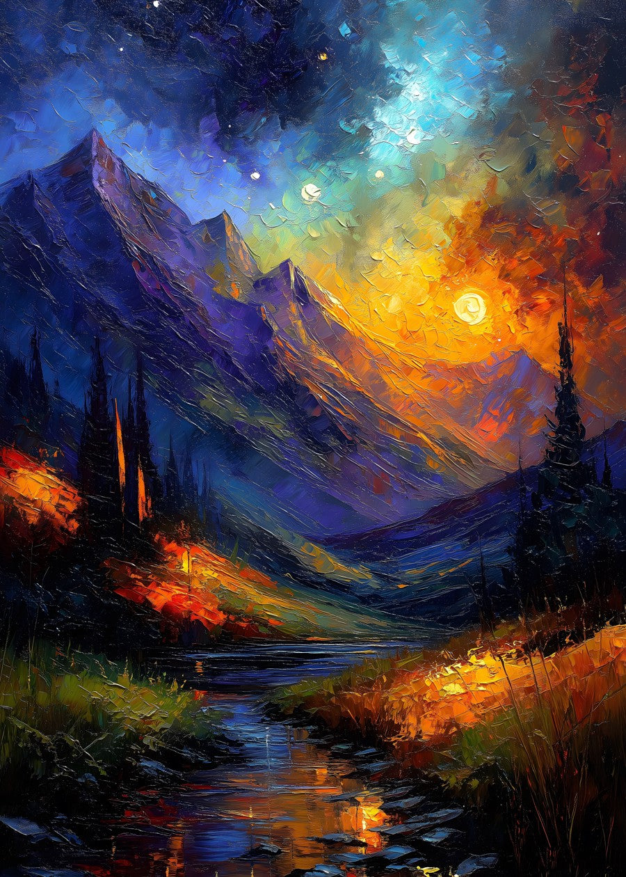 A vibrant, mystical landscape merging night and day in a colorful symphony.