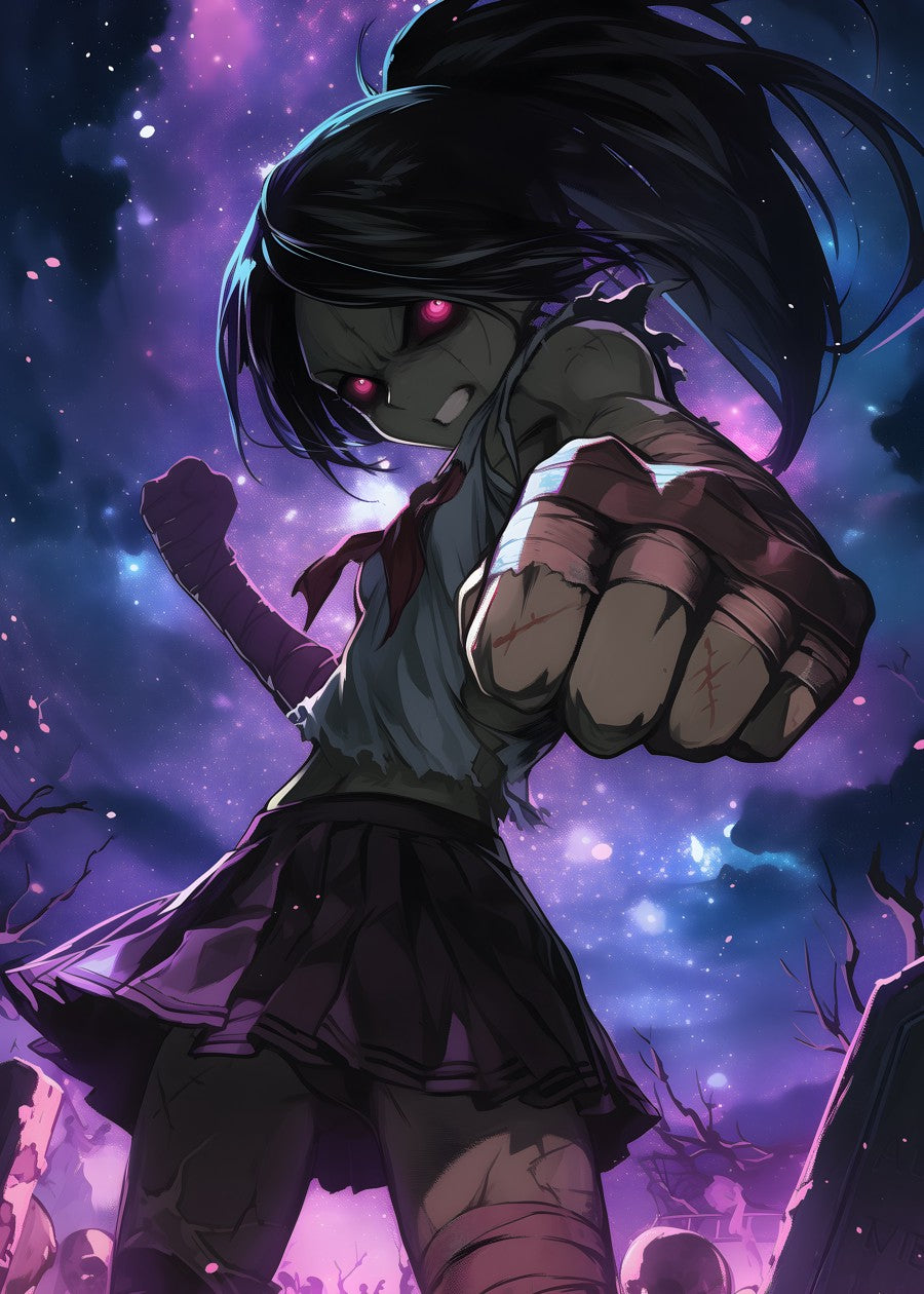 A fierce warrior emerges from a cosmic storm, eyes glowing with power.