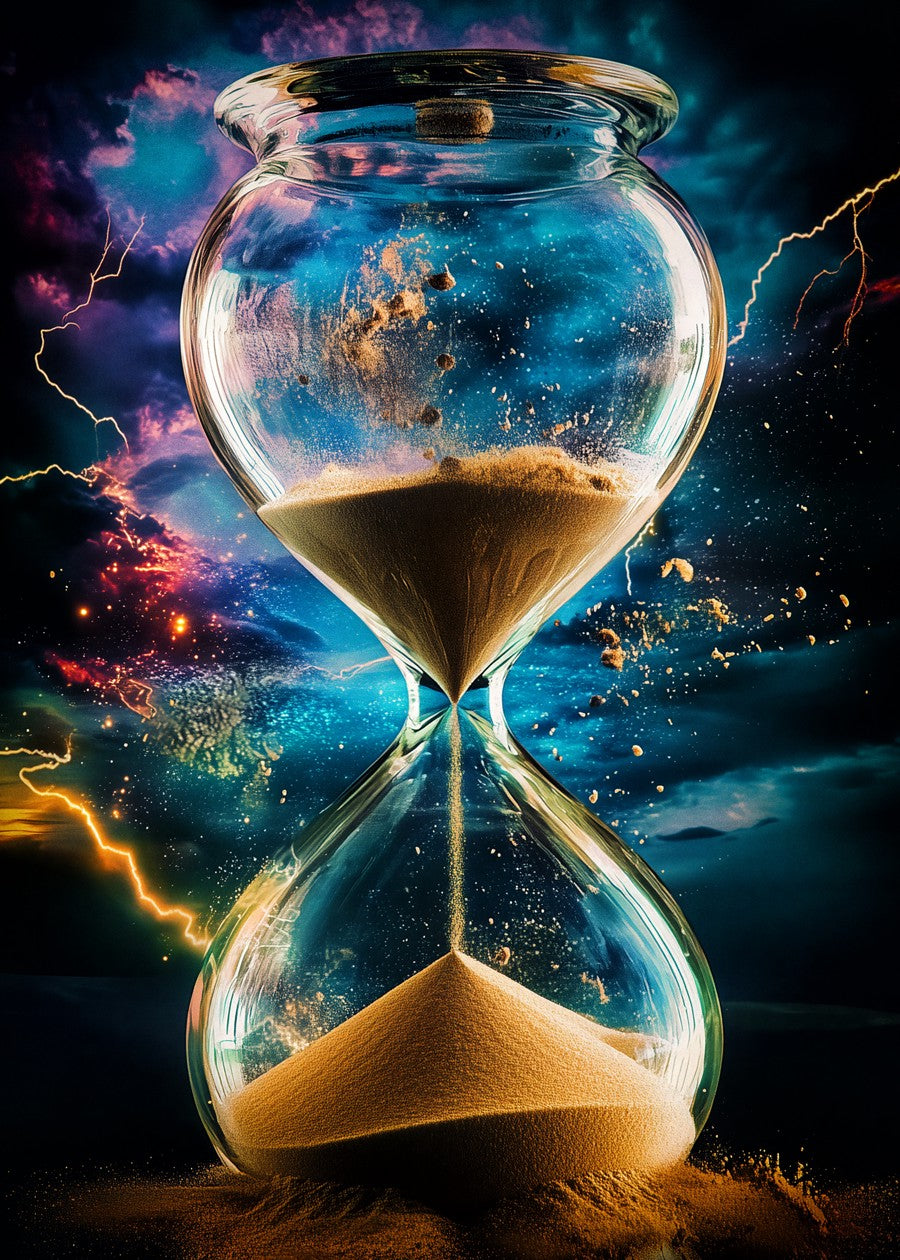 Hourglass with flowing sand against a dramatic cosmic storm. Lightning and nebula backdrop symbolize fleeting time and universal power.