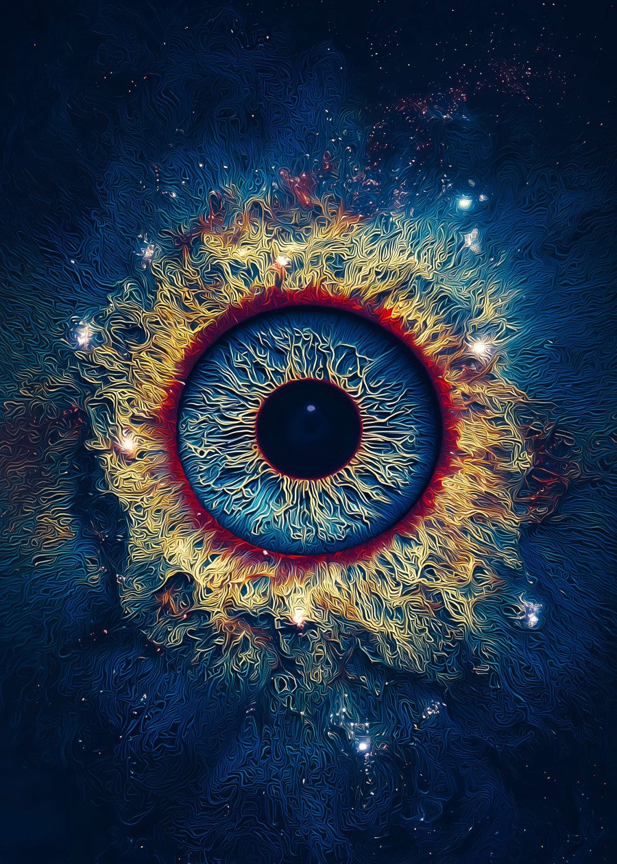 A highly detailed, psychedelic image of an eye's iris blended with a deep space nebula, perfect for fans of cosmic and surreal art.