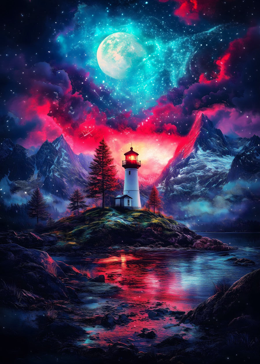 A lighthouse under a vibrant, enchanting sky of surreal colors and stars.