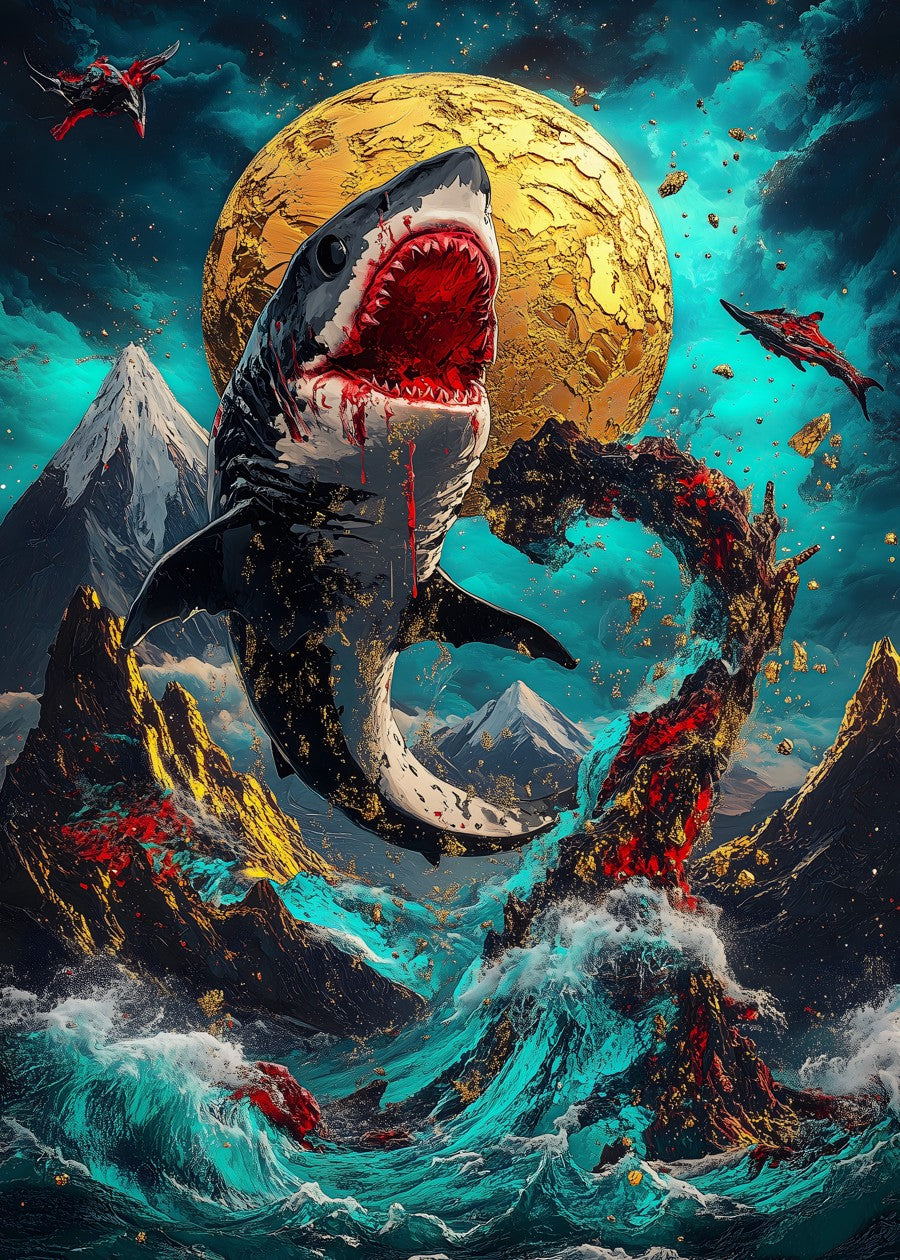 A colossal shark leaps through a celestial sea, a cosmic moon illuminating its path.