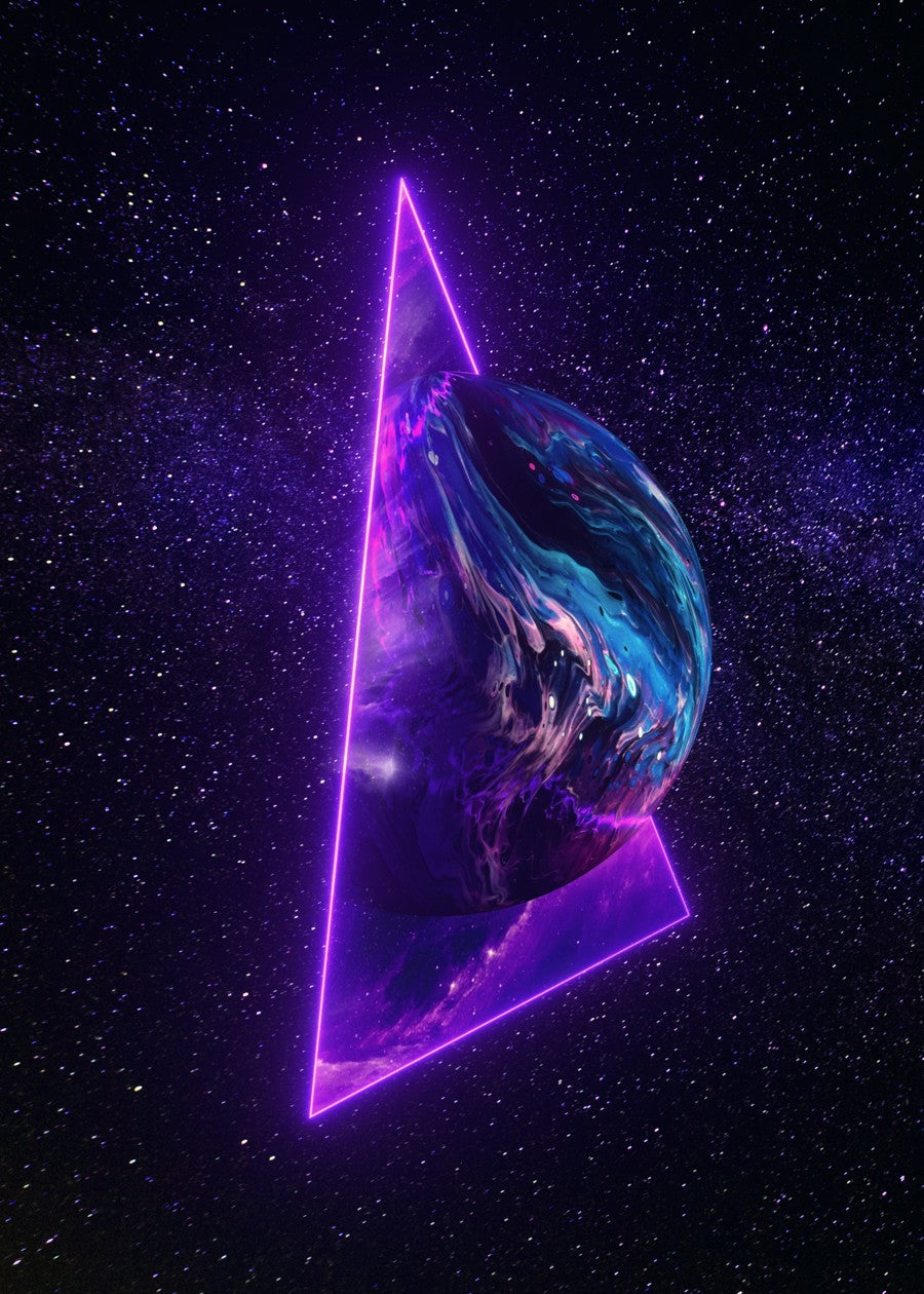 A swirling, vibrant blue and purple planet is dramatically framed within a glowing neon pink triangle, set against a starry cosmic backdrop.