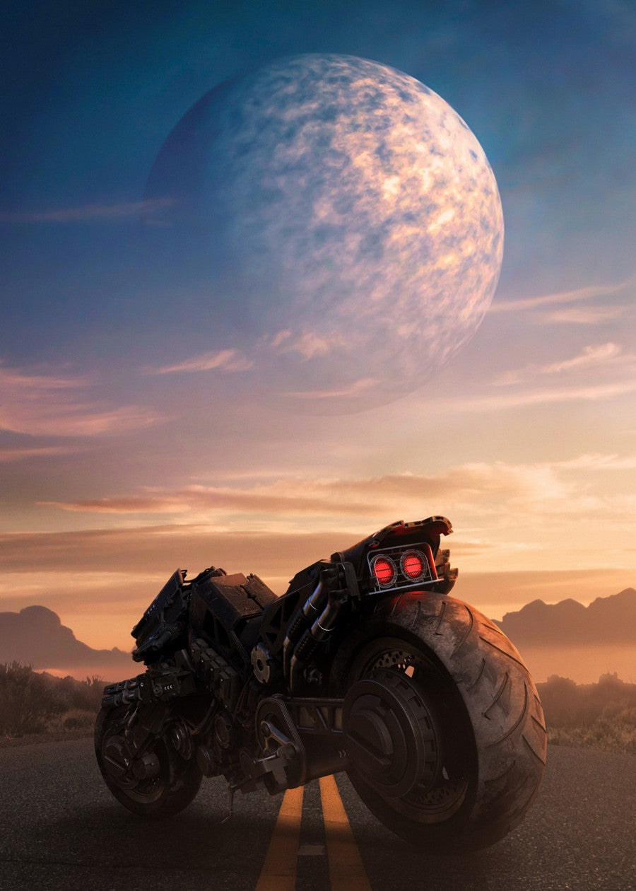 A rugged, futuristic bike stands on an open road, its destination unknown. Above, a giant moon looms large, promising a journey across a mys
