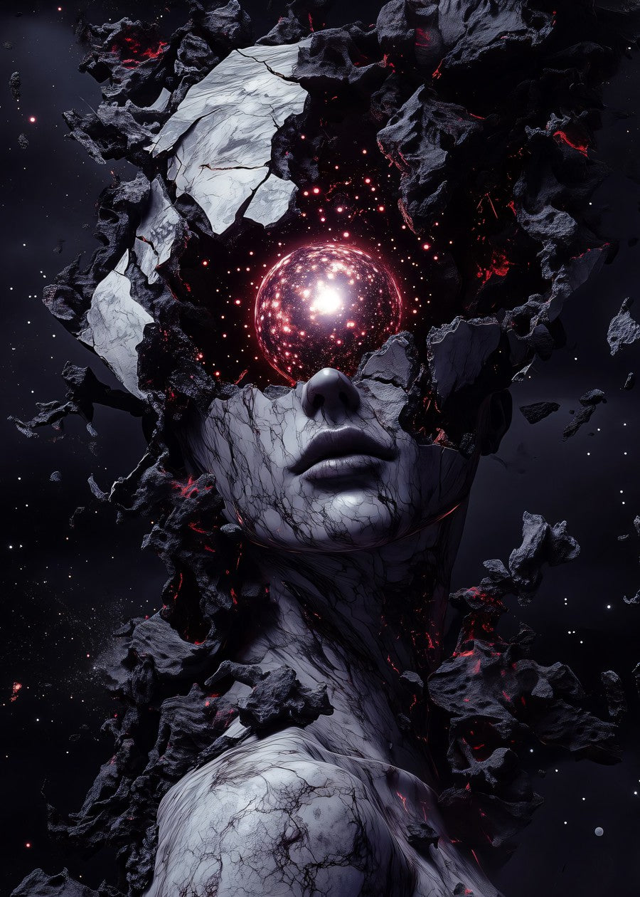 A surreal face emerges from celestial stone, eyes blazing with cosmic energy.