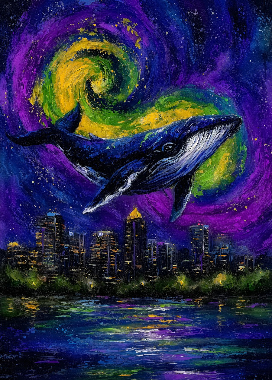 A majestic whale swims through a swirling cosmic sky above a vibrant cityscape.