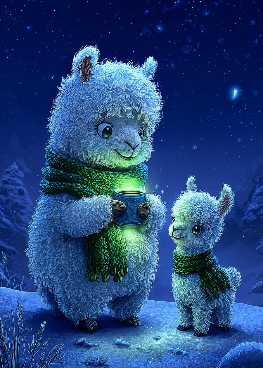 Two alpacas share a glowing cup of warmth under a starry winter sky, wrapped in green scarves and gentle smiles.