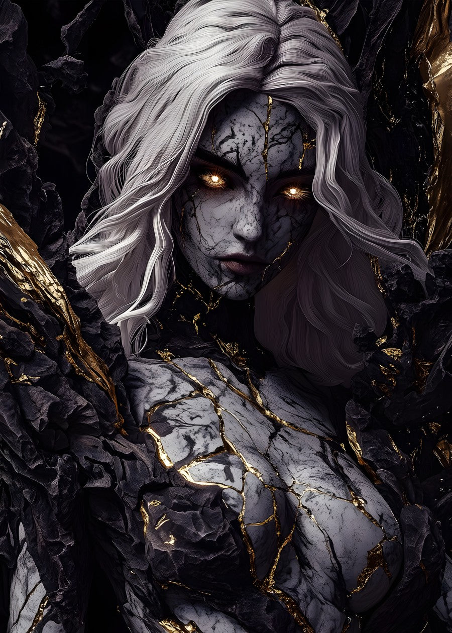A mystical figure emerges, adorned in crackling marble and golden veins, with an enigmatic gaze.