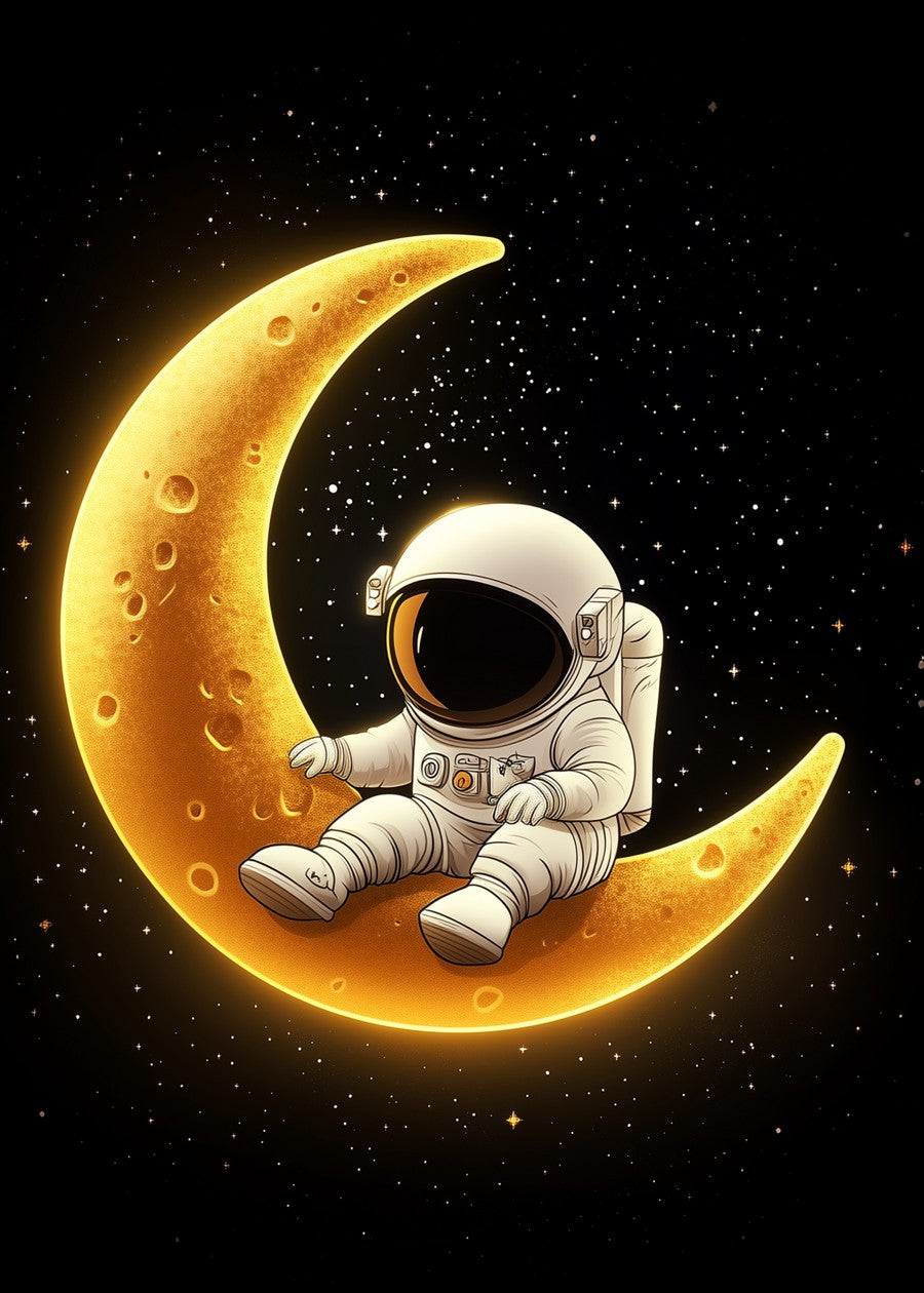 Astronaut on the Crescent Moon: Cute astronaut rests on a glowing crescent moon, surrounded by a starry black sky.