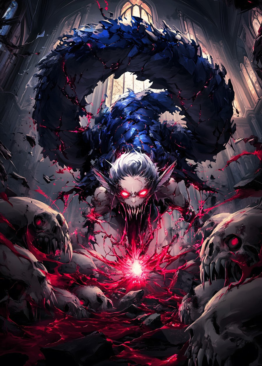 A dark entity emerges, glowing eyes piercing through shadows in a realm of chaos.
