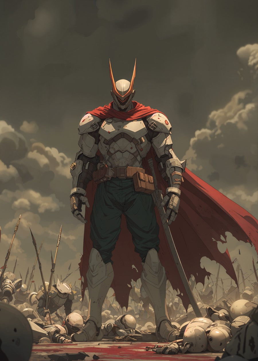 Alone he stands, crimson cape flowing, the last blade in a battlefield of silence. The future remembers only the undefeated.