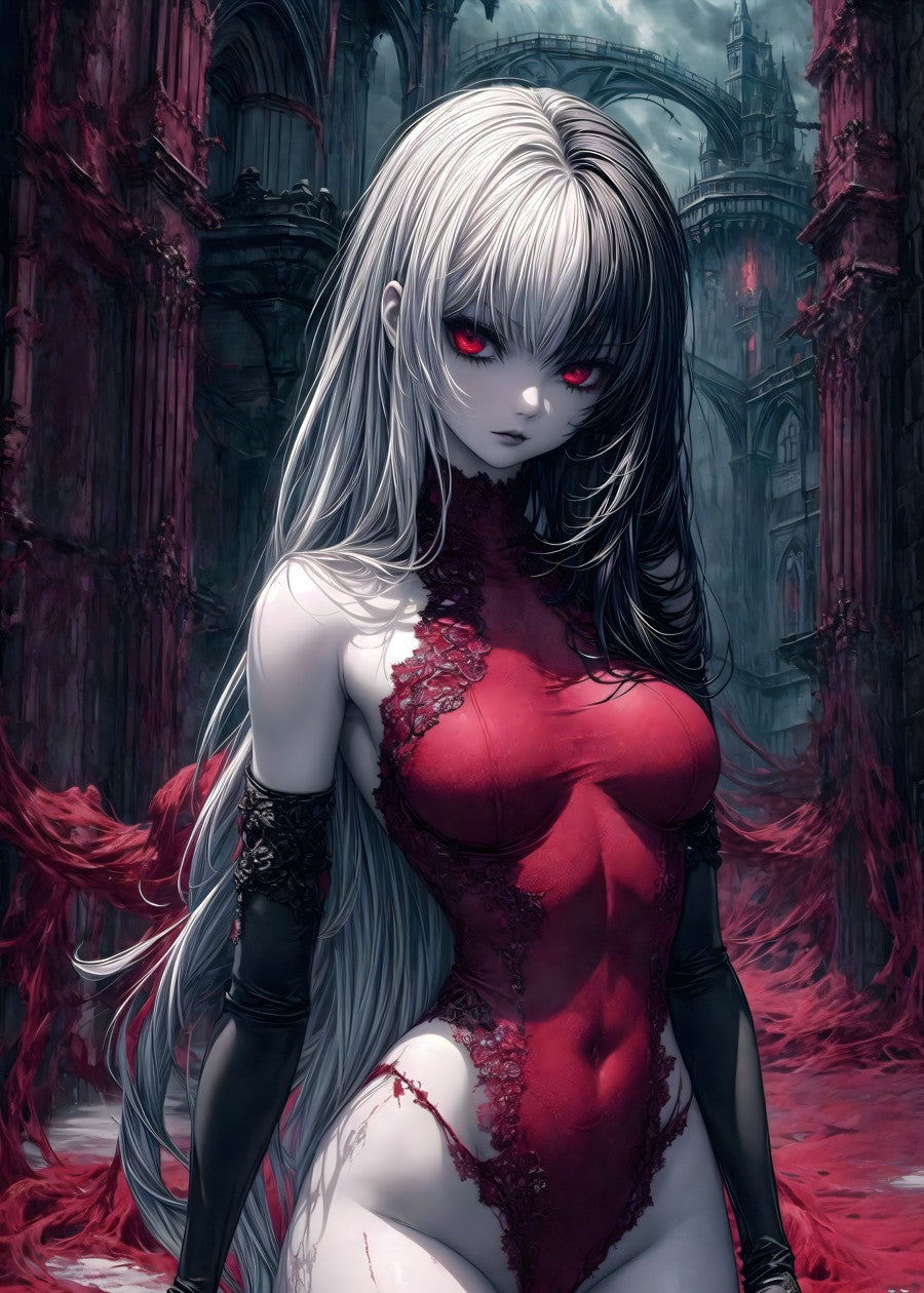 Mysterious figure in a gothic setting, exuding elegance and intrigue.