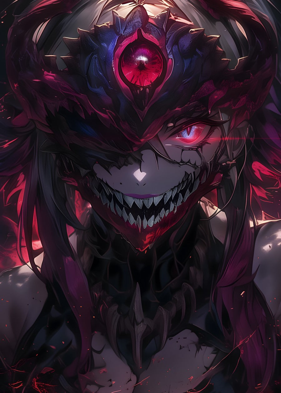 A menacing figure with piercing red eyes and a sinister smile lurks in the shadows.
