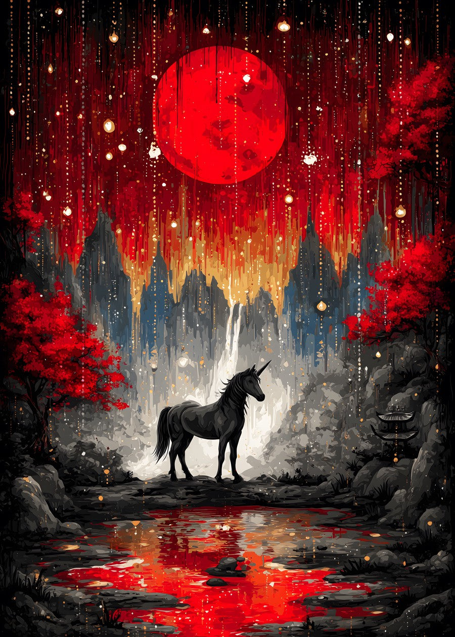 A unicorn stands under a red moon, surrounded by mystical scenery.