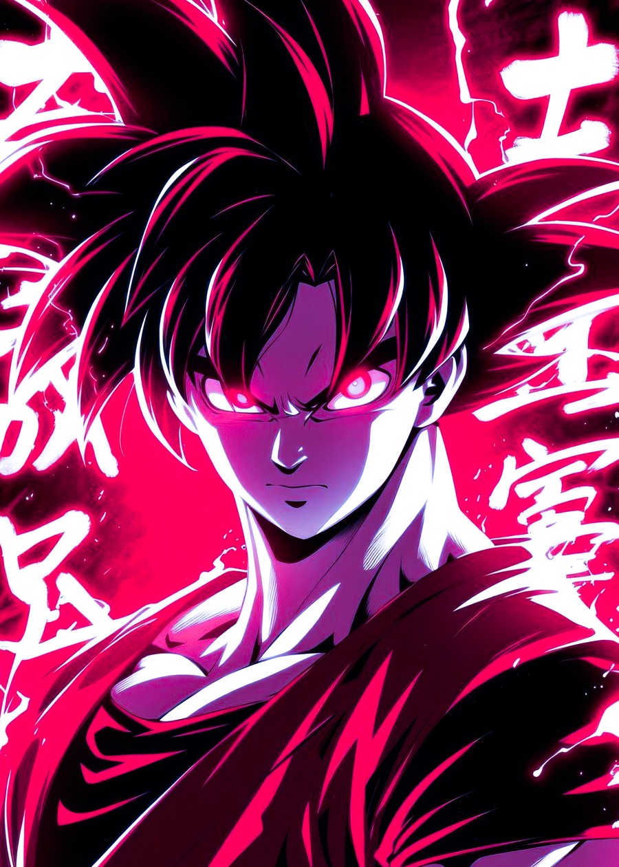 Crimson-lit Goku exudes strength and intensity, surrounded by fiery power and stylized calligraphy.