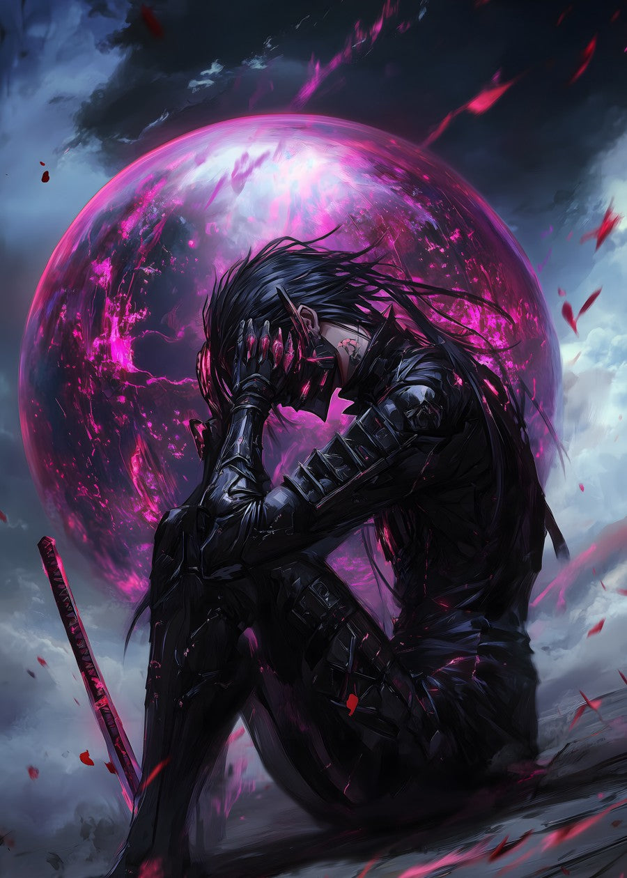 A lone warrior sits in contemplation beneath a glowing, mystical orb.