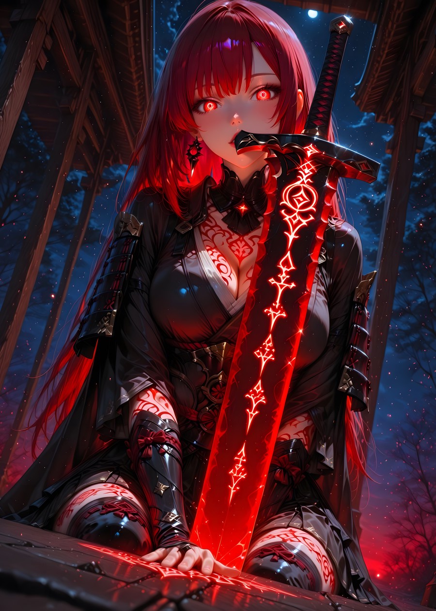 Enigmatic figure with a glowing sword stands ready beneath a starry sky.