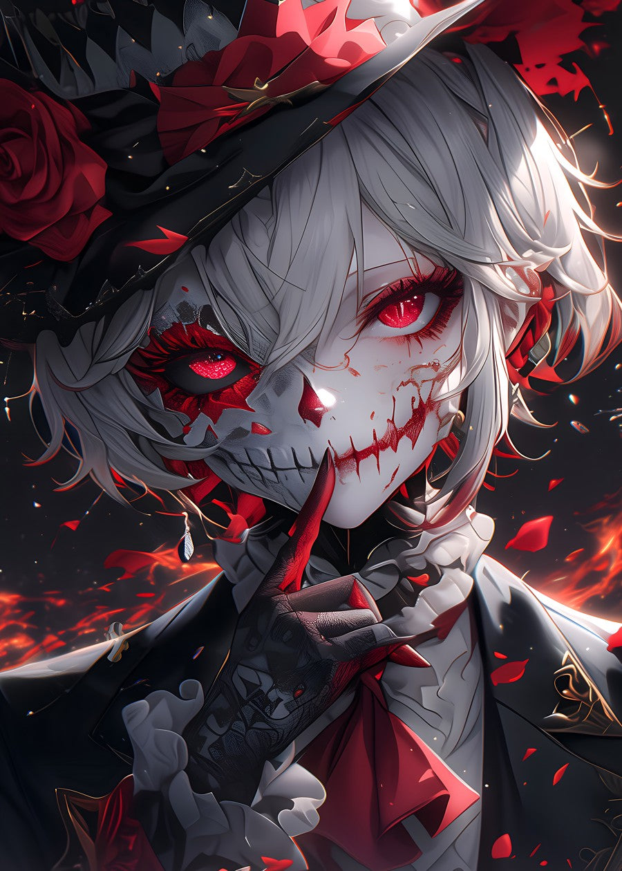Enigmatic figure with a skeletal face and red eyes, adorned with roses.