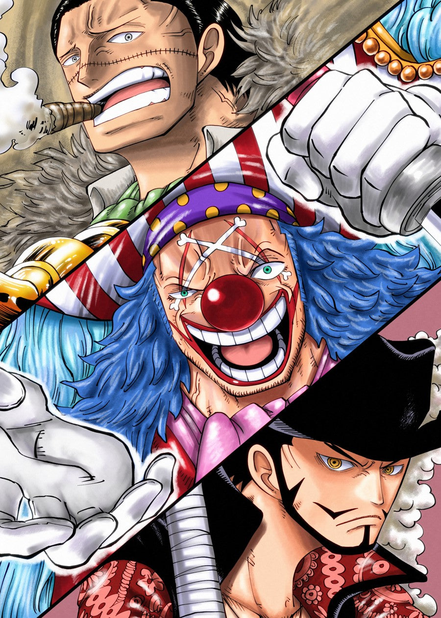 The three members of the Cross Guild – Crocodile, Buggy, and Dracule Mihawk – depicted in a dynamic and colorful split image.