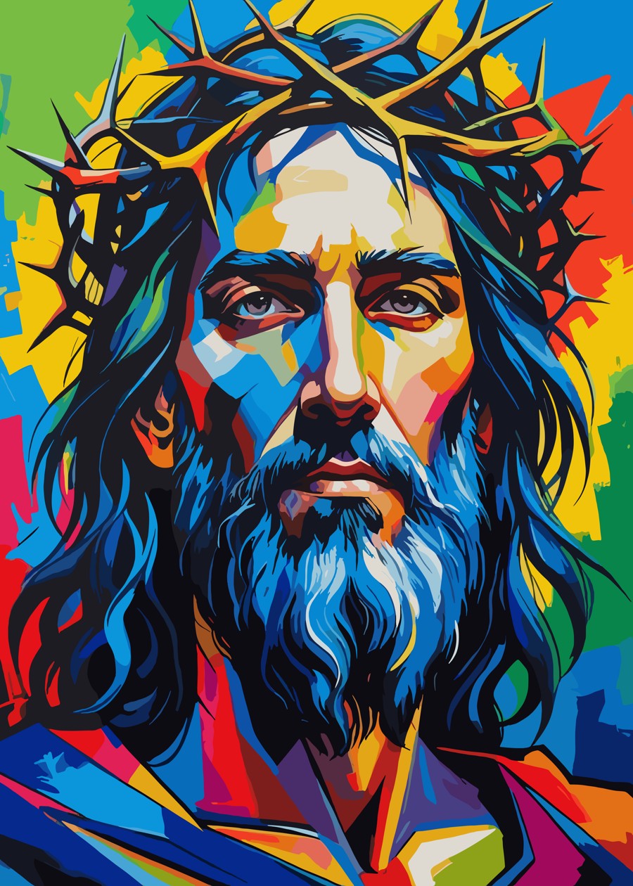 vivid pop art rendering of a figure with a crown of thorns, bursting with energetic colors and sharp outlines for a modern artistic.