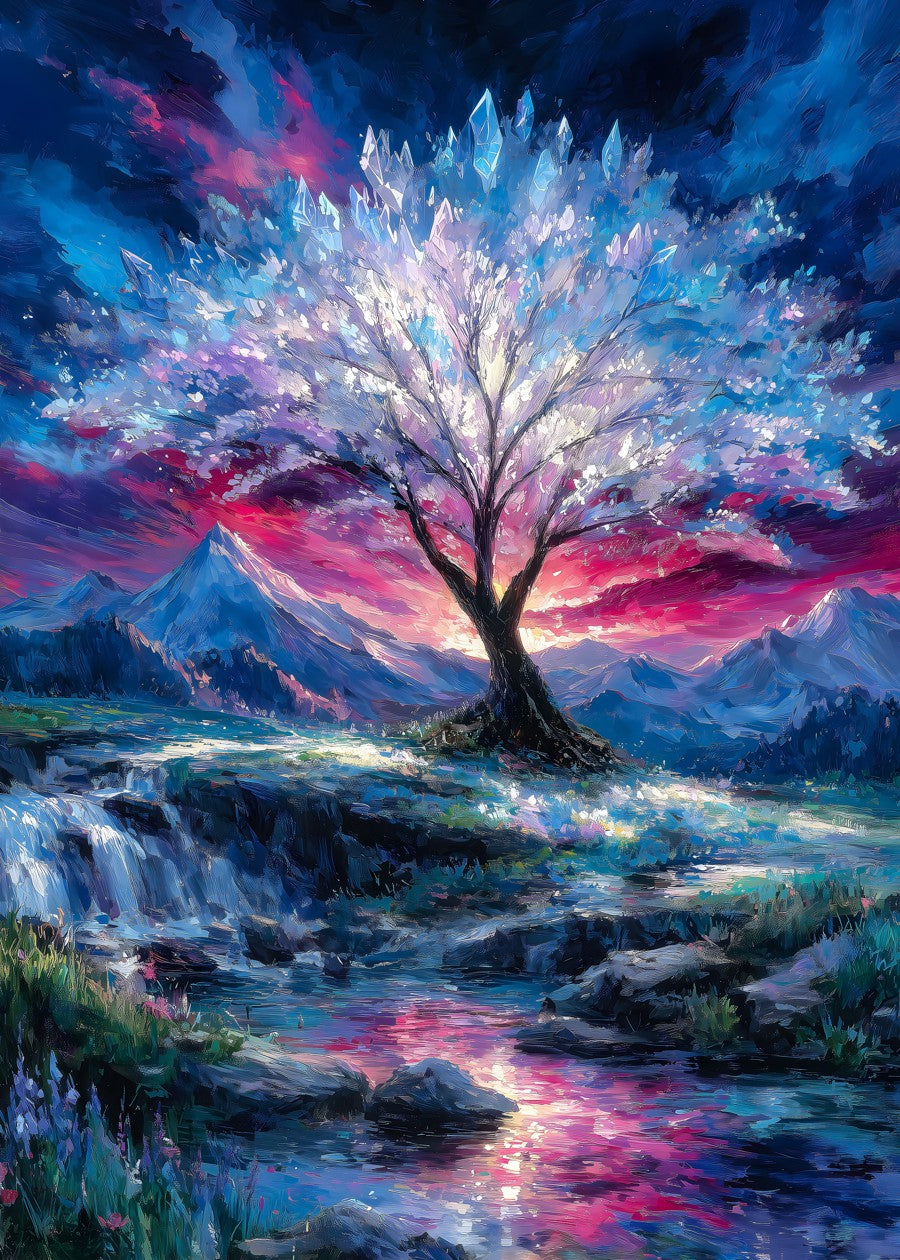 A luminous tree with crystal-like blossoms against a vibrant twilight sky.