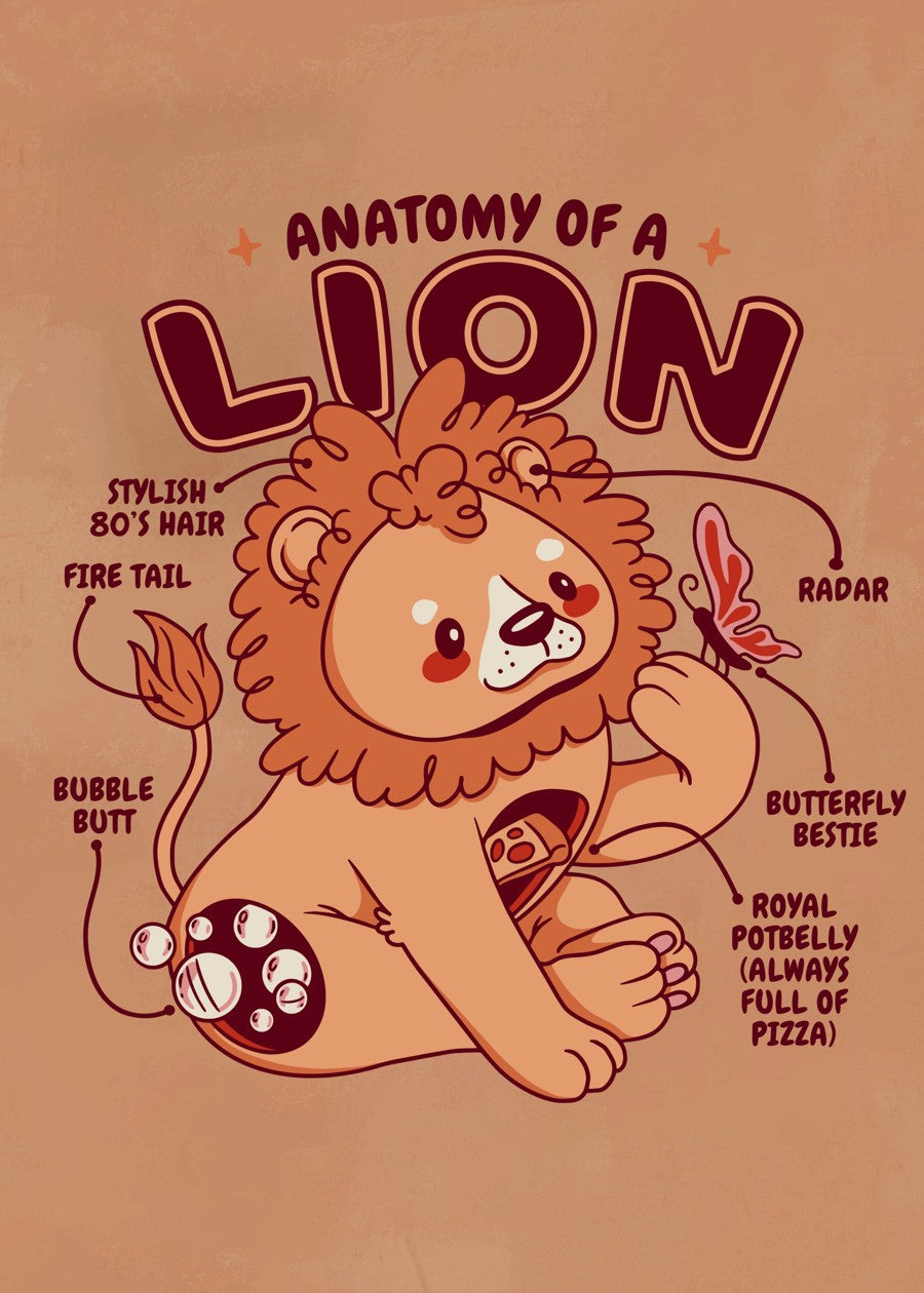 An adorable, funny diagram of a cartoon lion, featuring a "bubble butt" and "royal potbelly." Perfect for a nursery or playful decor.