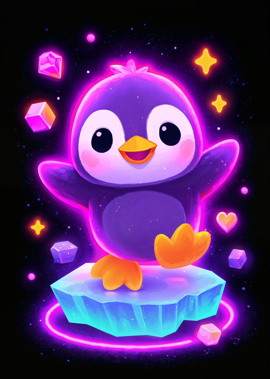 Adorable purple penguin glowing in space with neon gems and stars, floating happily on a cosmic ice block.