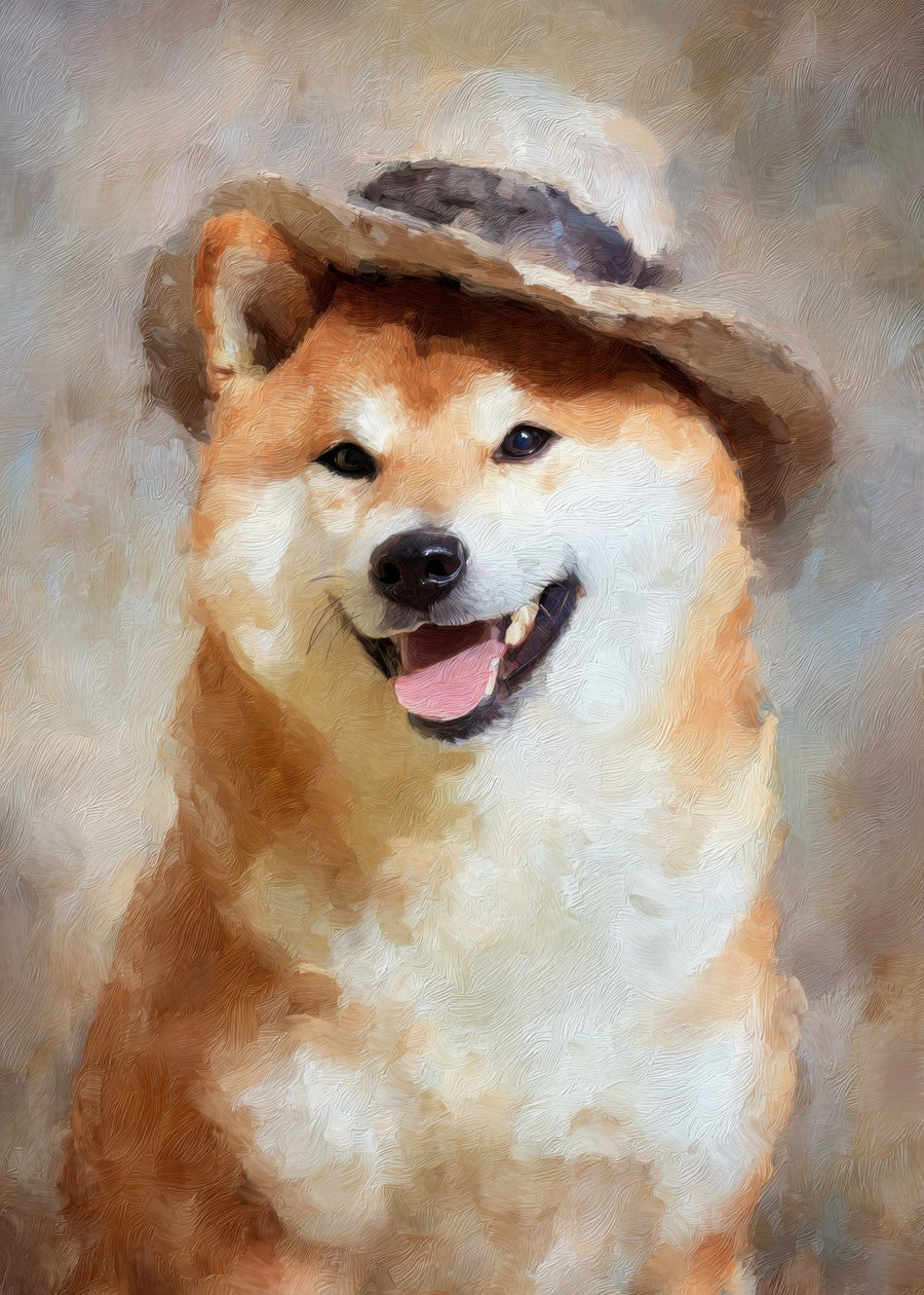A cute shiba inu dog wearing a hat, with a smiling face.