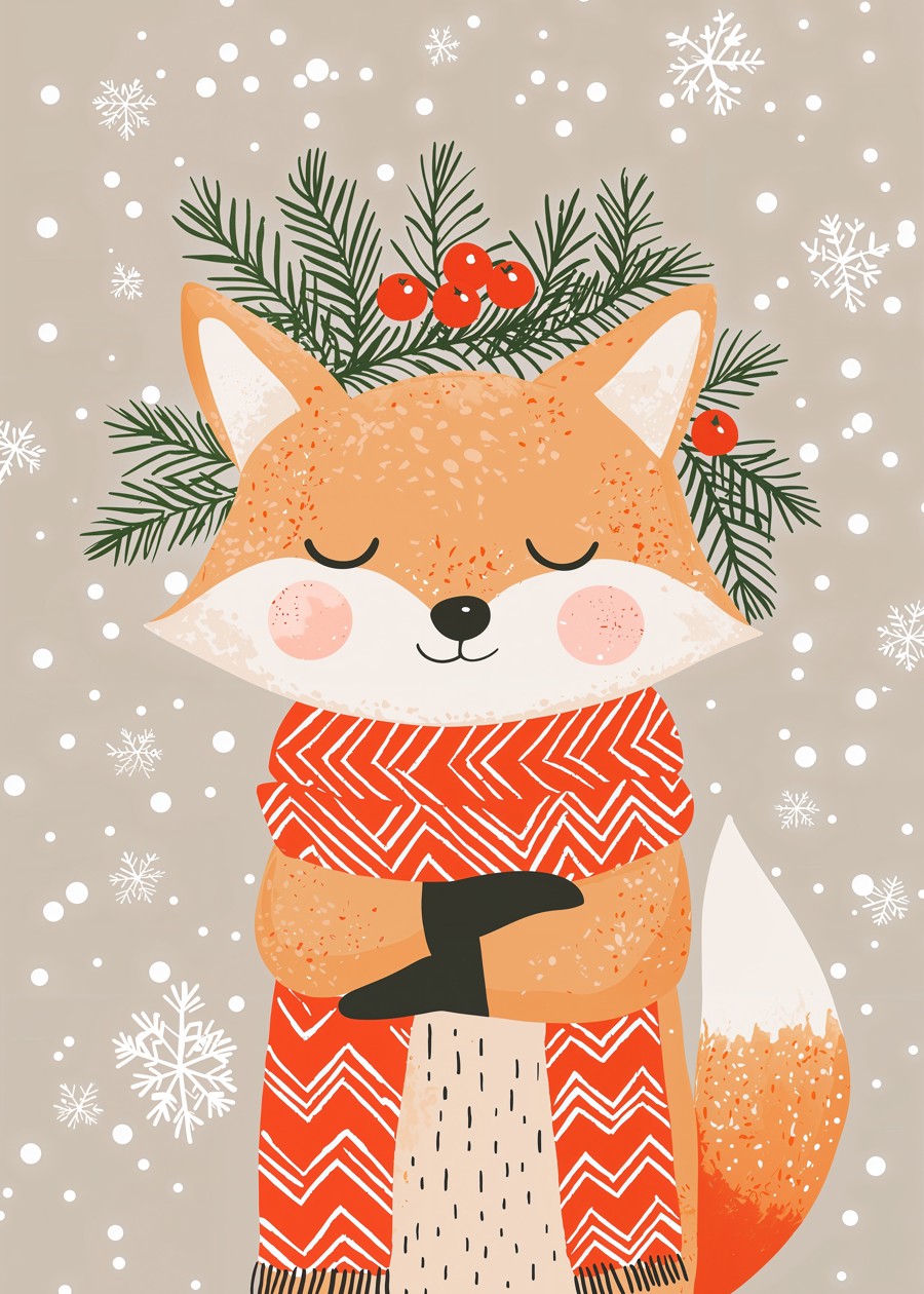 Adorable fox with scarf and snowflakes, perfect for cozy holiday vibes and winter lovers.