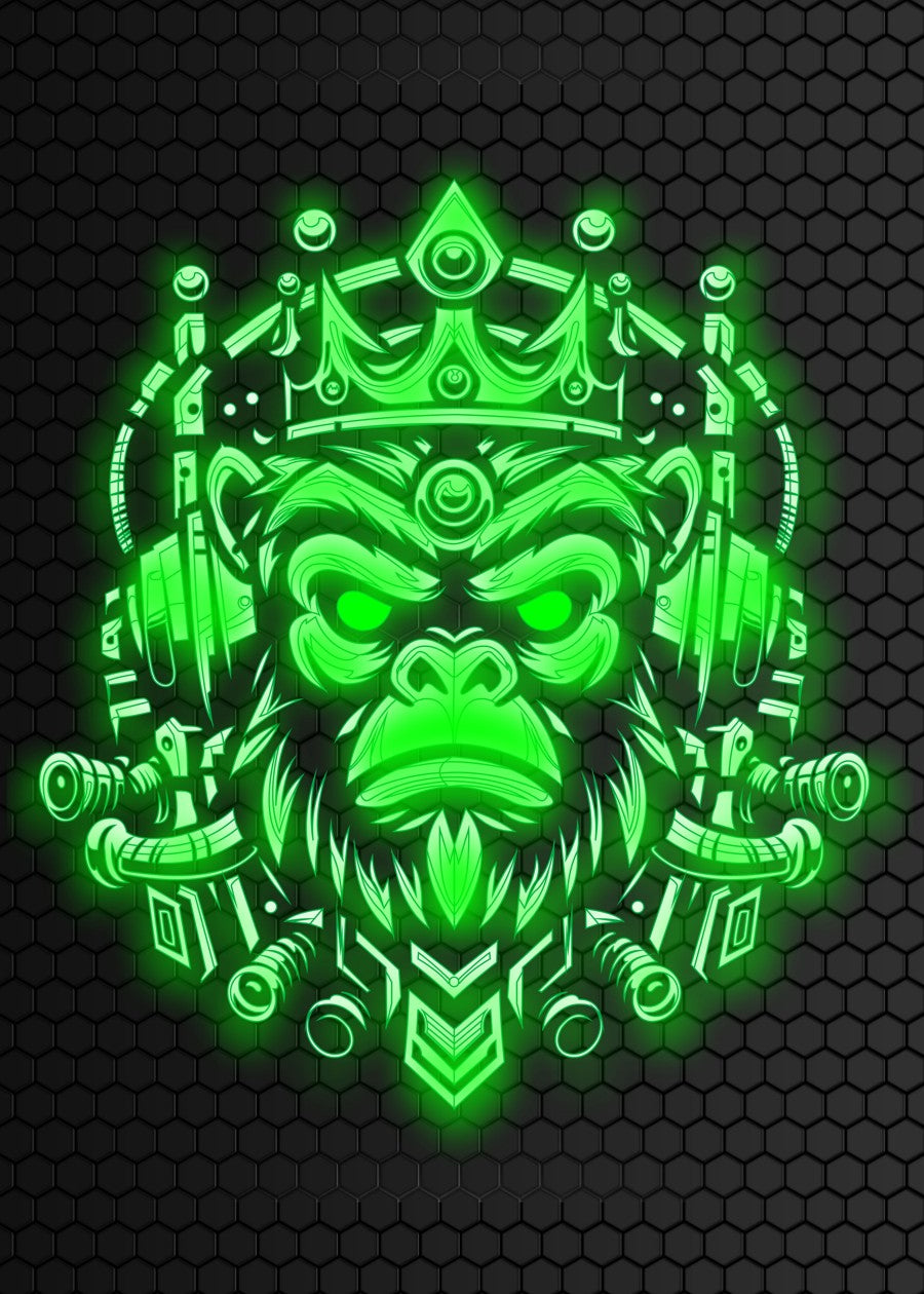 A futuristic neon green gorilla head with mechanical details and a regal crown, radiating power and dominance against a bold dark background