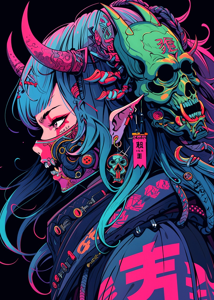 A fierce cyber demon girl fuses gothic elegance with futuristic rage.