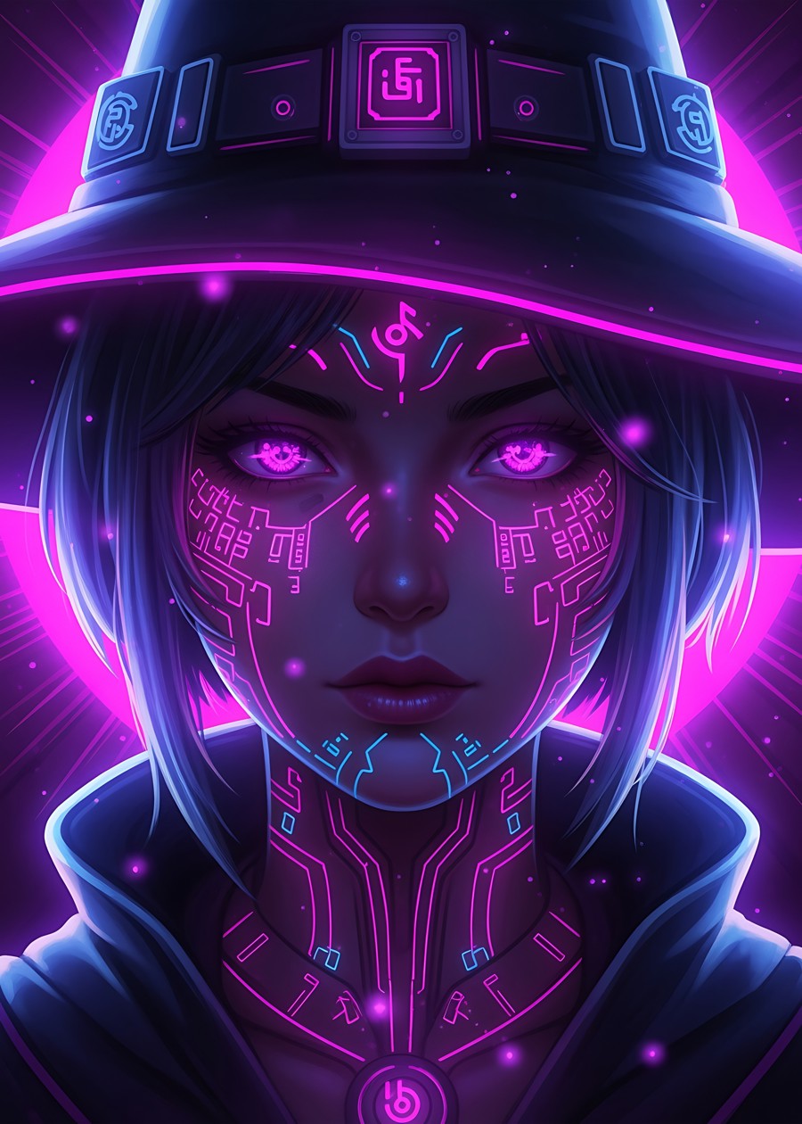 A close-up portrait of a woman wearing a witch hat, illuminated by bright purple and blue neon lights with intricate futuristic and magical.