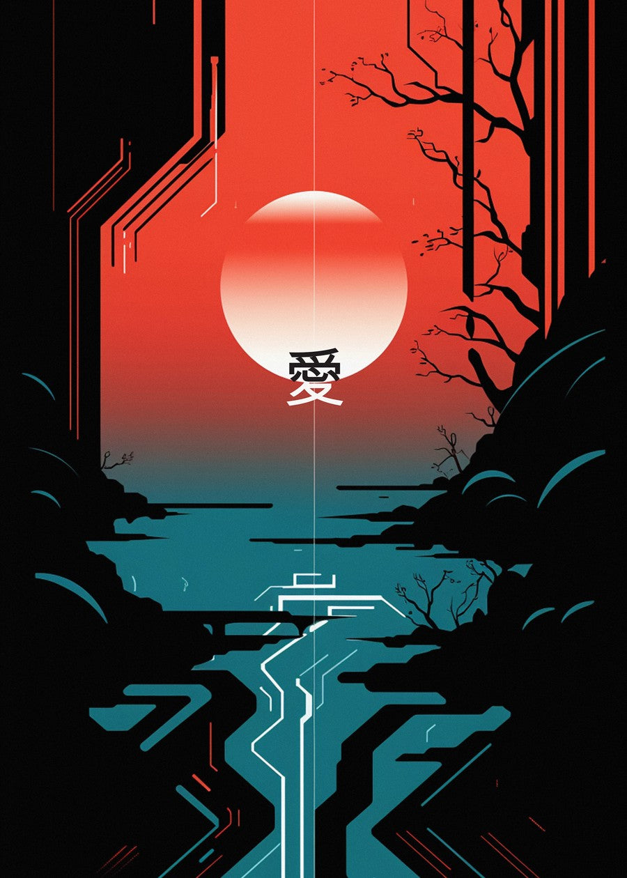 Minimalist cyberpunk landscape with a red sun, teal river/circuitry, and the Japanese kanji for 'Love' (愛) at the center.