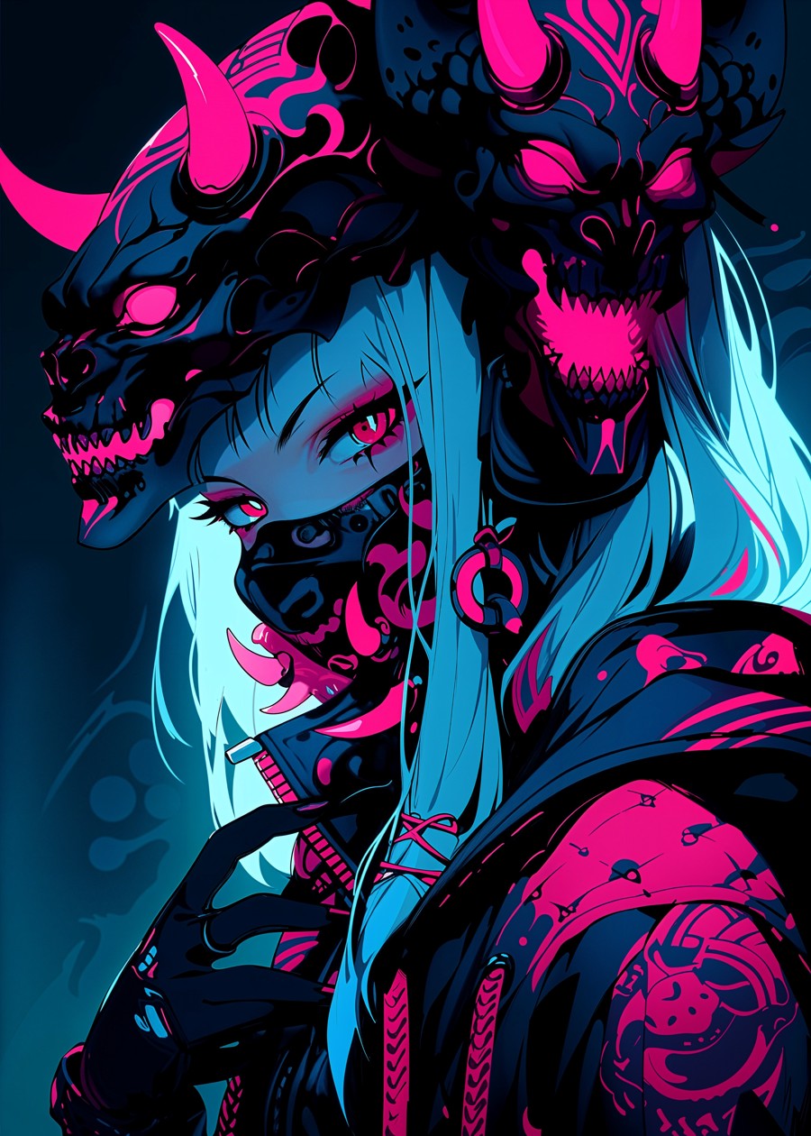 A young woman with long, flowing blue hair, wearing a black leather jacket and a black mask with pink accents.