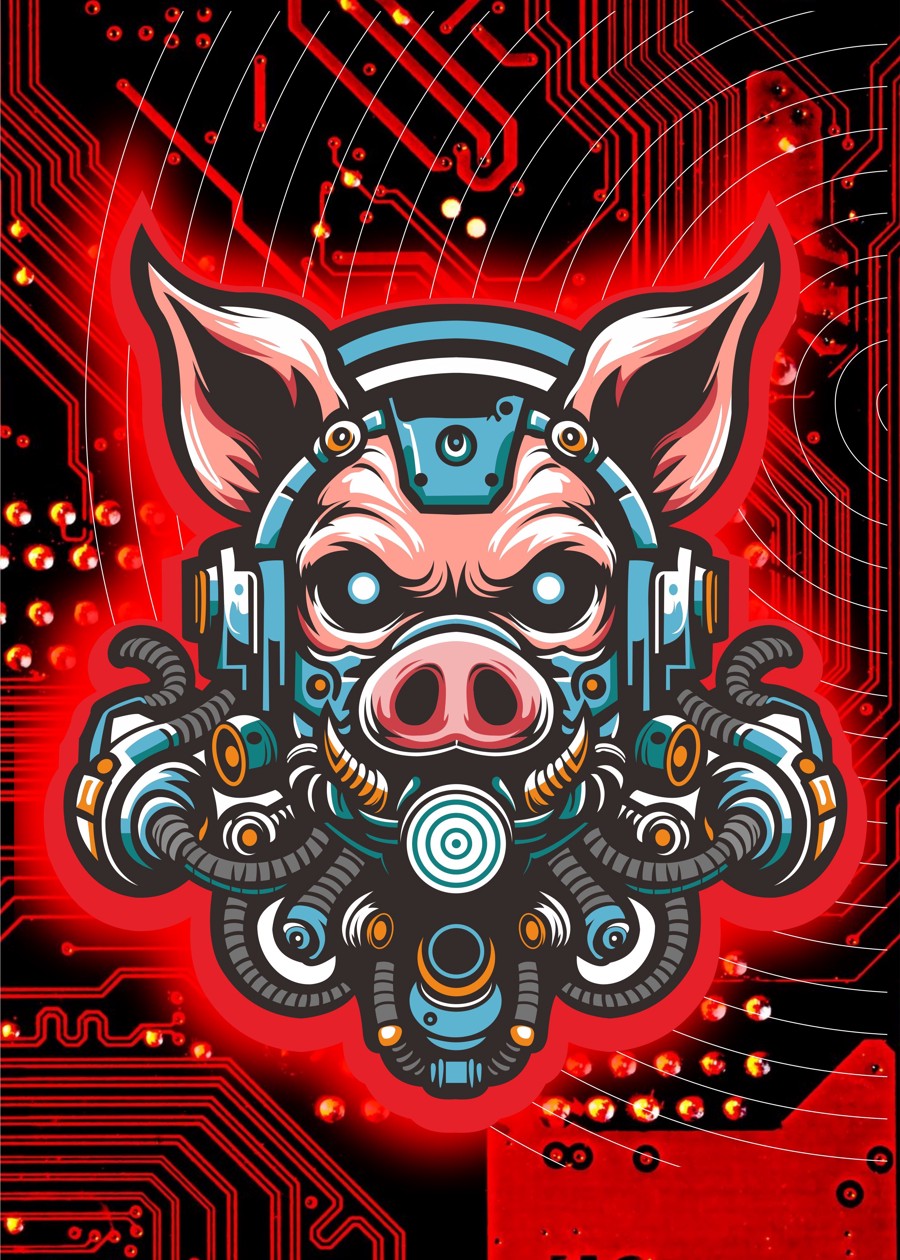 A striking cyberpunk-inspired illustration of a pig transformed into a powerful cyborg.