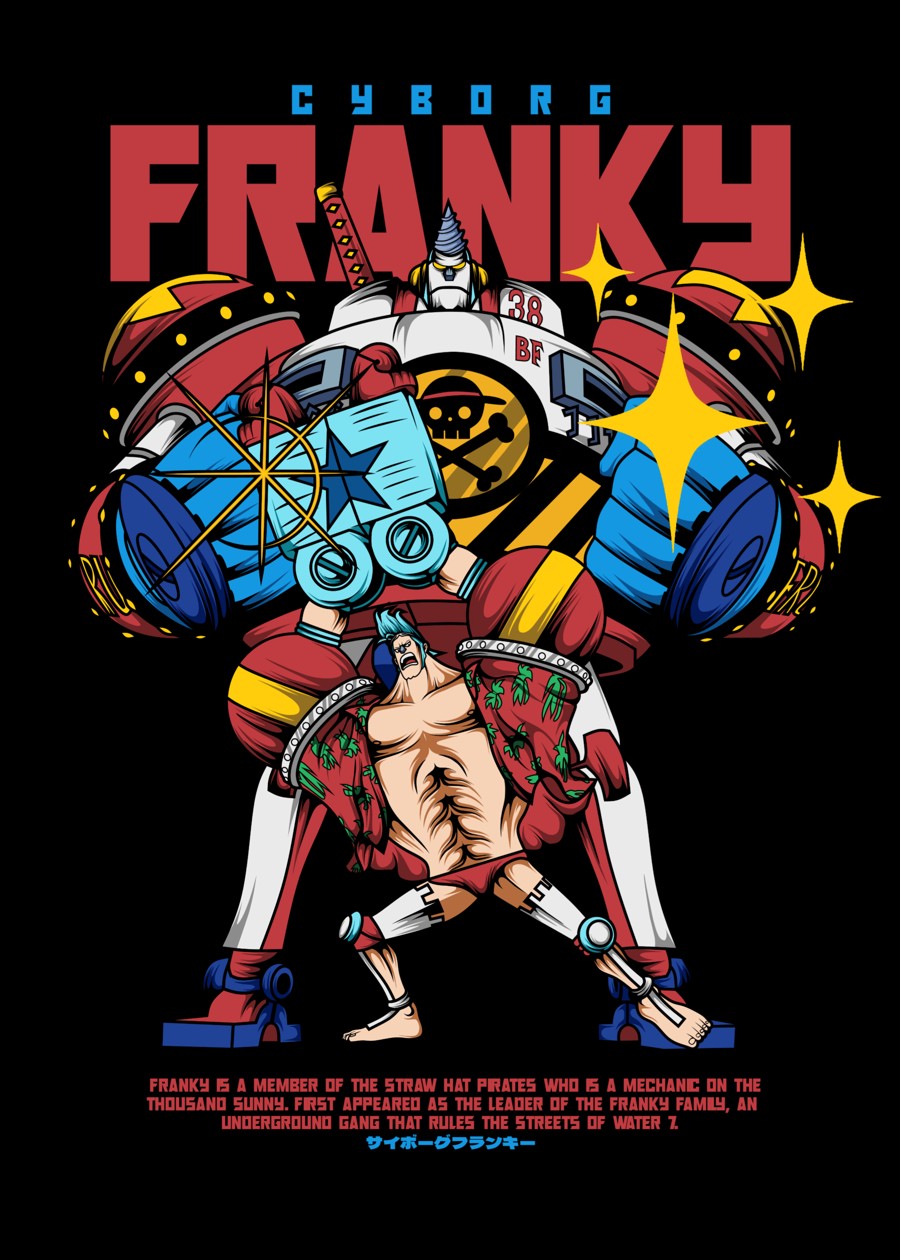 Franky, the Straw Hat shipwright, is a cyborg genius and former gang leader from Water 7. He’s SUPER in every way!