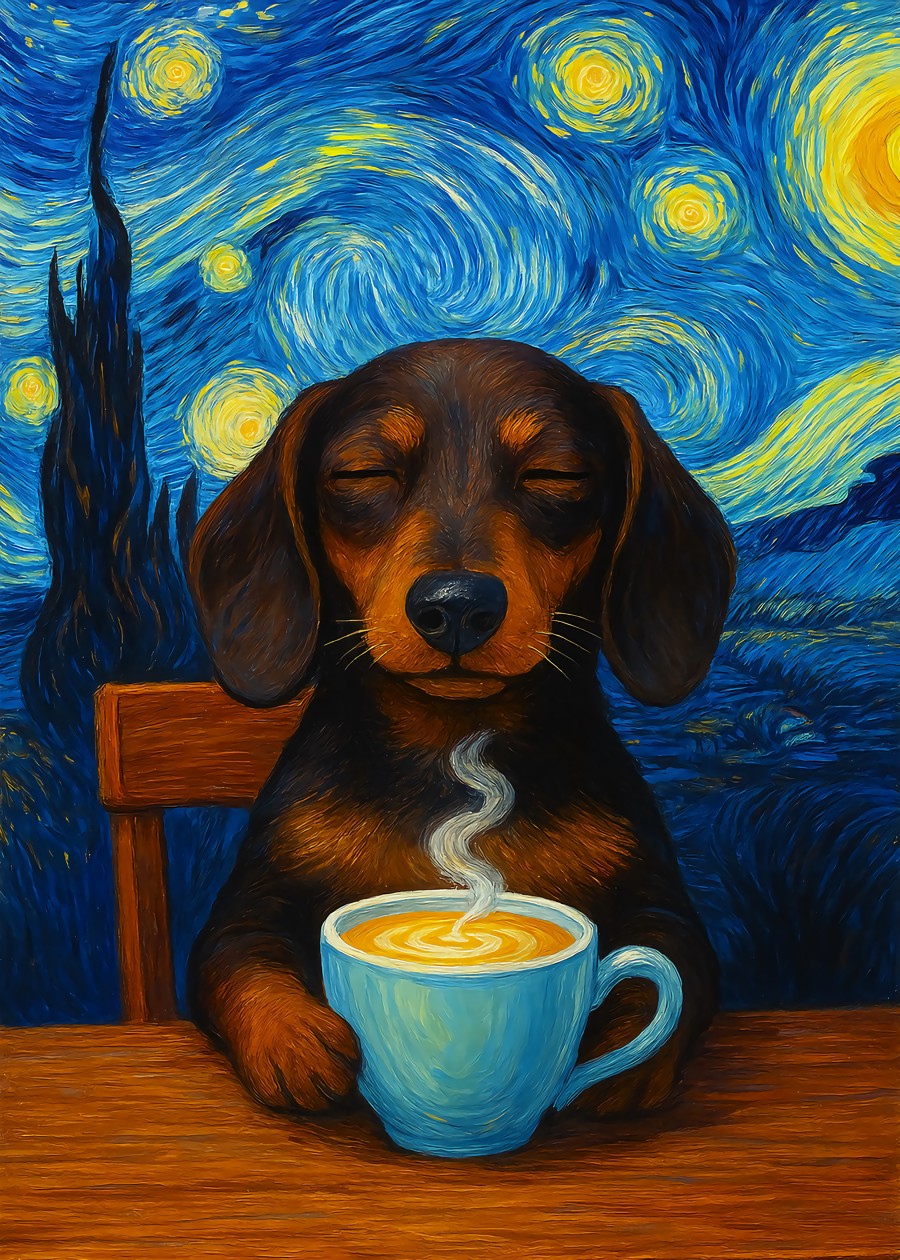Add charm and whimsy to your space with this Dachshund Coffee Starry Night. Inspired by Van Gogh’s iconic Starry Night, the art