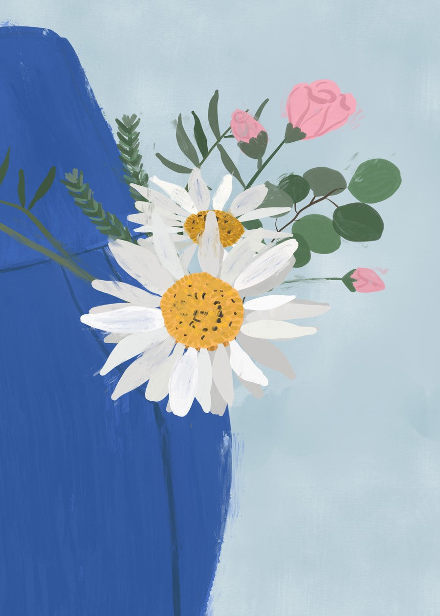 Simple charm: white daisies and soft pink roses peek from a bold blue vase against a calm pastel sky.