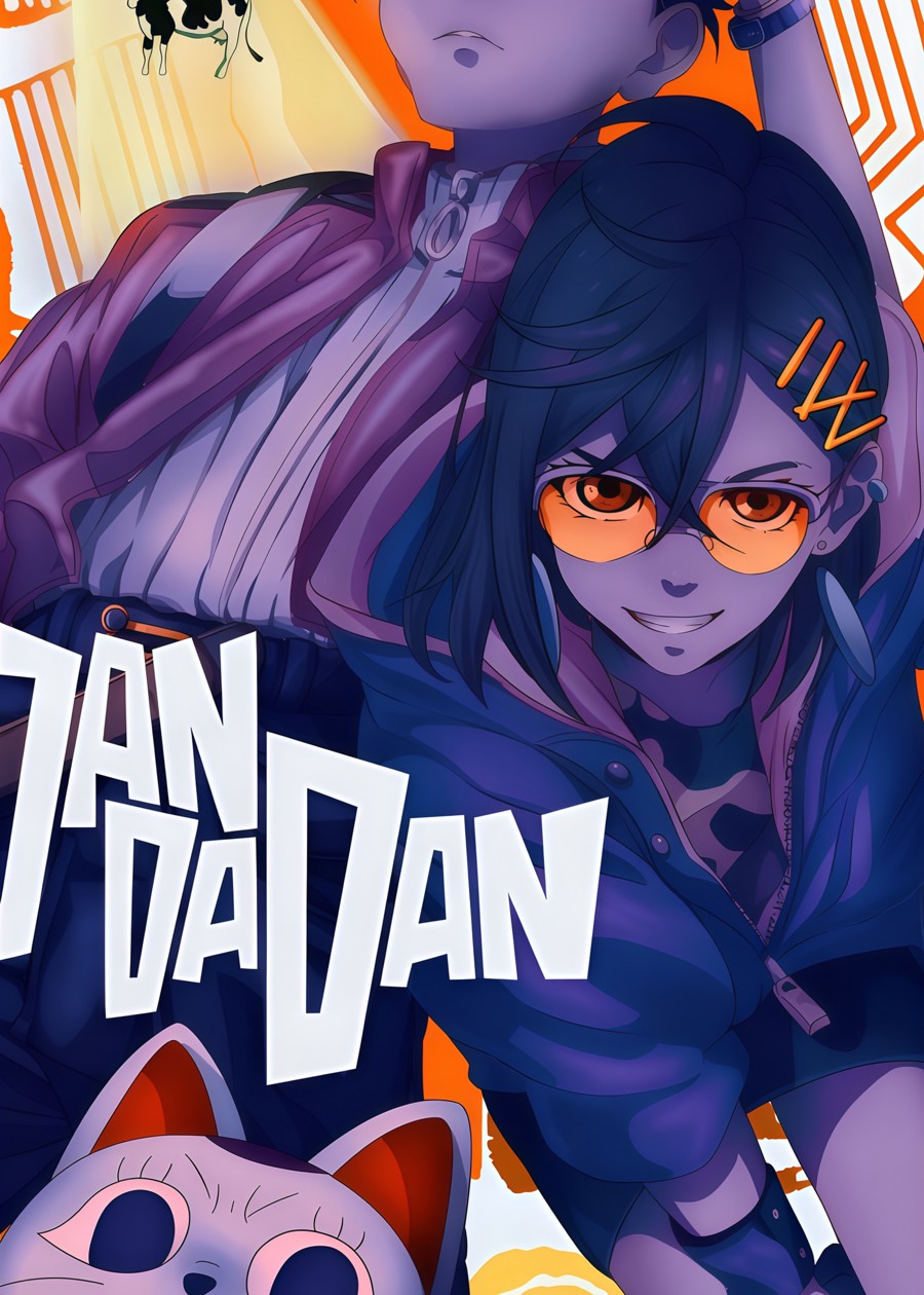 Okarun in his school uniform, holding his glasses, with a psychic split revealing an aggressive, colorful eye.